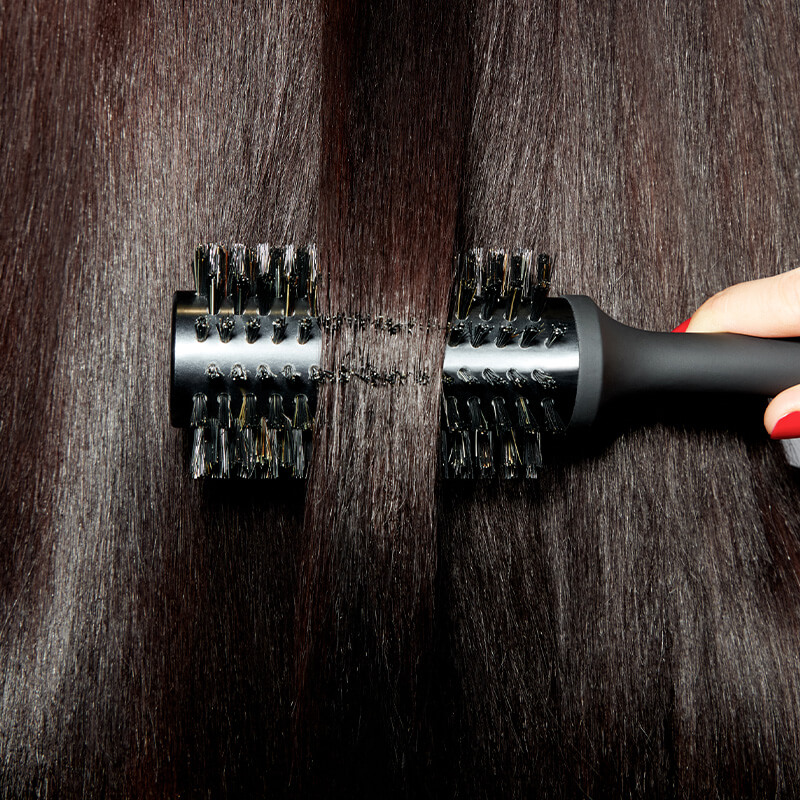 Start with about 80% dry hair. Divide your hair into sections and place the round brush at the hairline. Aim the centering nozzle of the hair dryer at the bristle body, making sure to keep the hair under tension at all times. The desired volume depends on the angle: the higher you raise the brush, the more volume you achieve, and vice versa. Then work through the hair section by section.