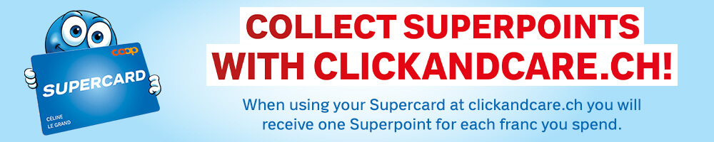 With your Supercard you get one Superpoint per CHF 1 purchase at clickandcare.ch.