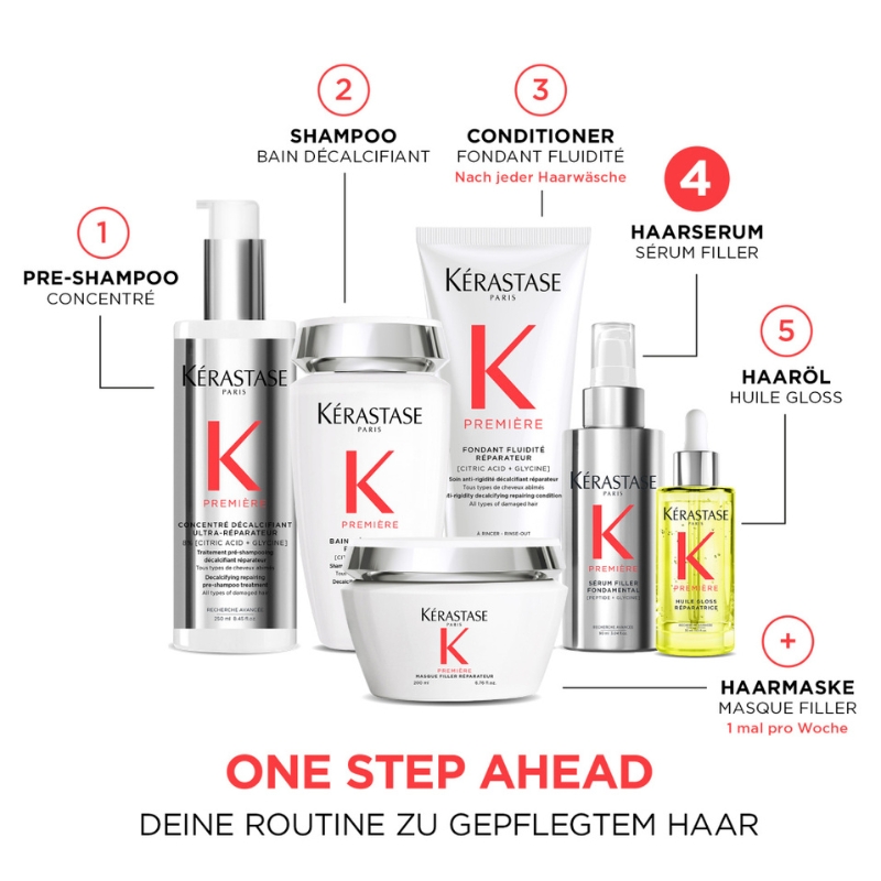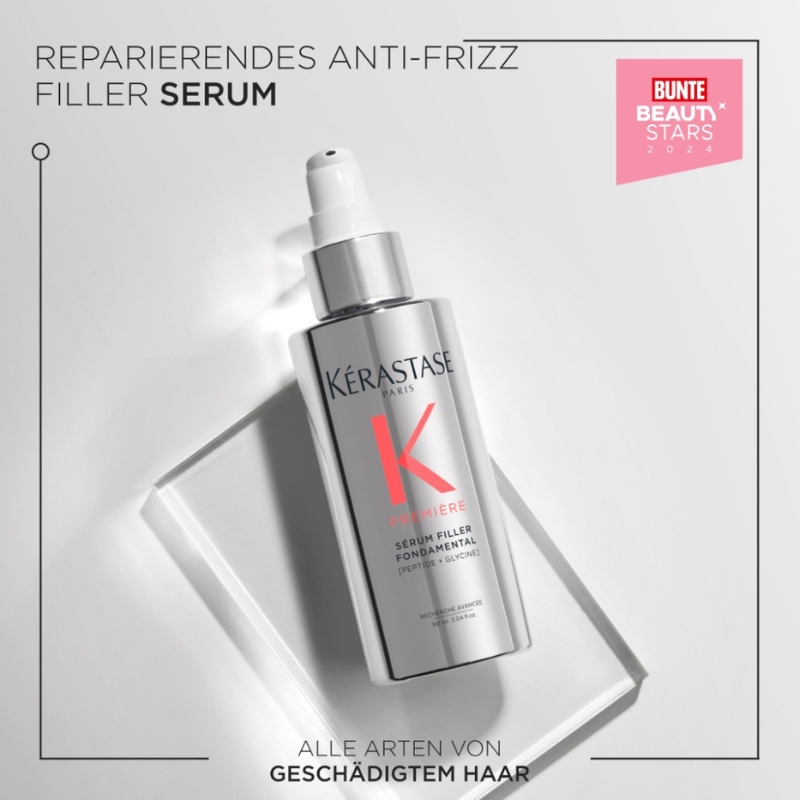 Découvre dès maintenant le Première Sérum Filler Fondamental de Kérastase. Ce sérum anti-frisottis de luxe scelle et remplit tes cheveux. Enrichi de précieux nutriments, il donne à tes cheveux brillance et force et les protège de la chaleur jusqu'à 230°C. Il répare les cheveux traités et abîmés de l'intérieur.